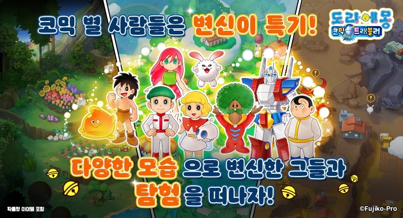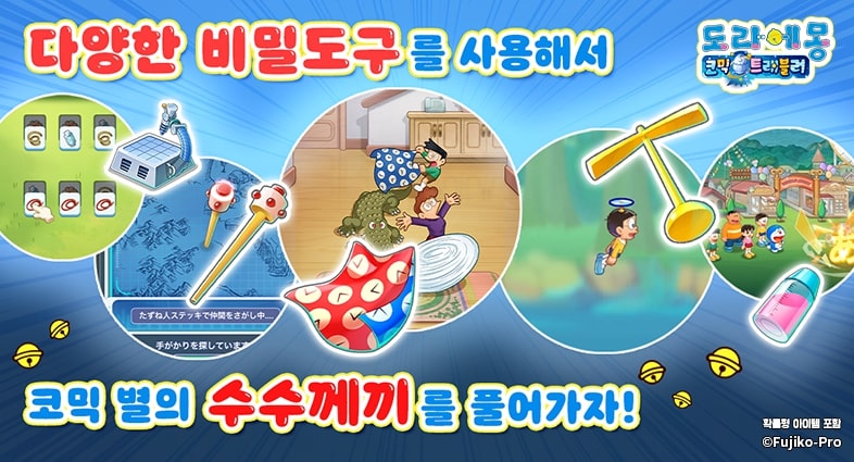 도라에몽, 진구, 이슬이, 퉁퉁이, 비실이 일행과 함께, 비밀도구를 사용해서 스테이지를 공략하고, 코믹 성인들과의 교류를 즐겨보세요!